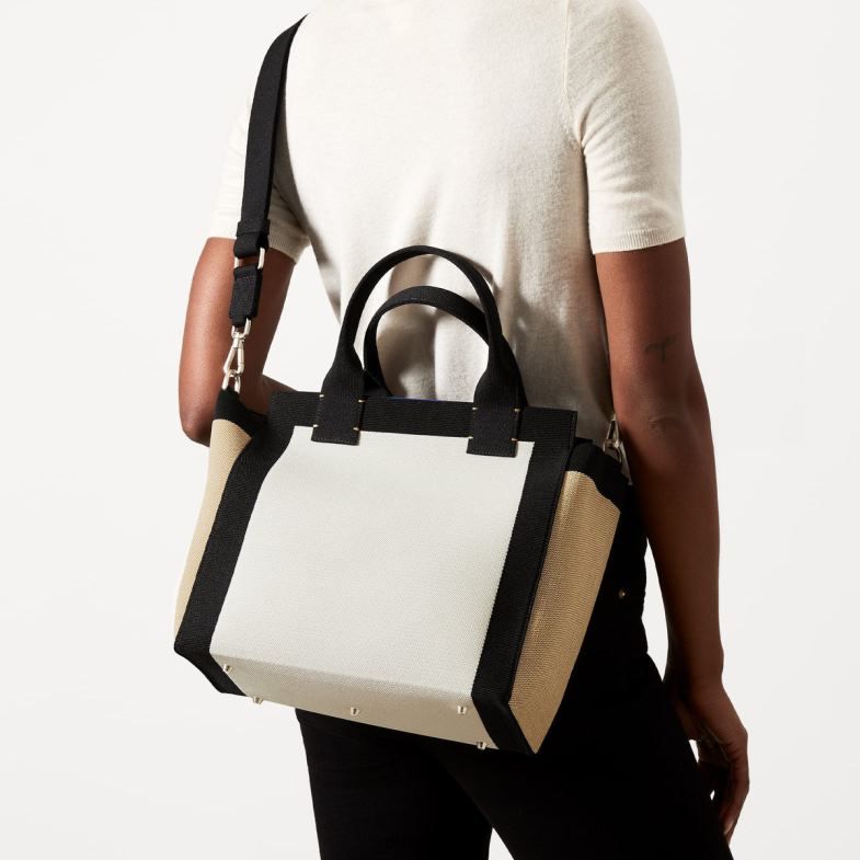 ひとつのバッグで、無限の可能性を。取り外し可能なストラップと耐久性のあるトップハンドルを備えた、アイボリー、ブラック、ライトキャメルの洗えるハンドバッグは、クロスボディまたは肩掛けとして着用できます。さらに、海洋プラスチックで作られています。