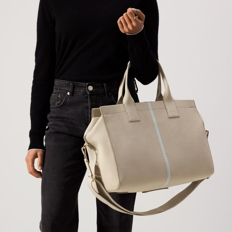 素早い旅行用にデザインされたこの一泊用バッグは、ブラウンとクリームのチェック柄にミントブルーのアクセントが施されており、調節可能で取り外し可能なストラップとトップハンドルが特徴で、多用途性を最大限に高めています。さらに、ほとんどの航空会社では、前の座席の下や頭上の棚に収まります。